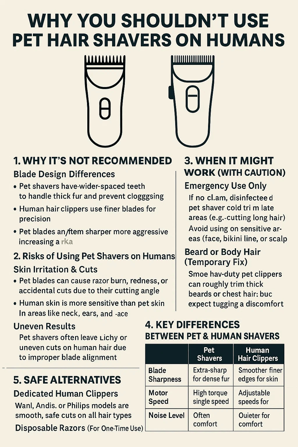 Evcil hayvan tırnakları genellikle uygunsuz bıçak hizalaması nedeniyle insan saçında düzensiz veya düzensiz kesimler bırakırlar.