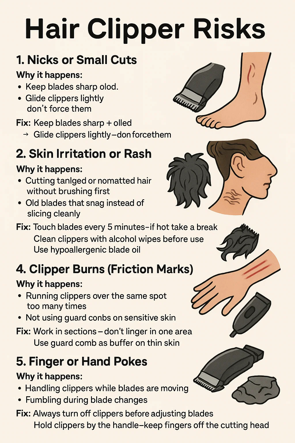 Kirli saç kesme makinelerinin kullanılması (sıkışmış saç, eski yağ, bakteri).