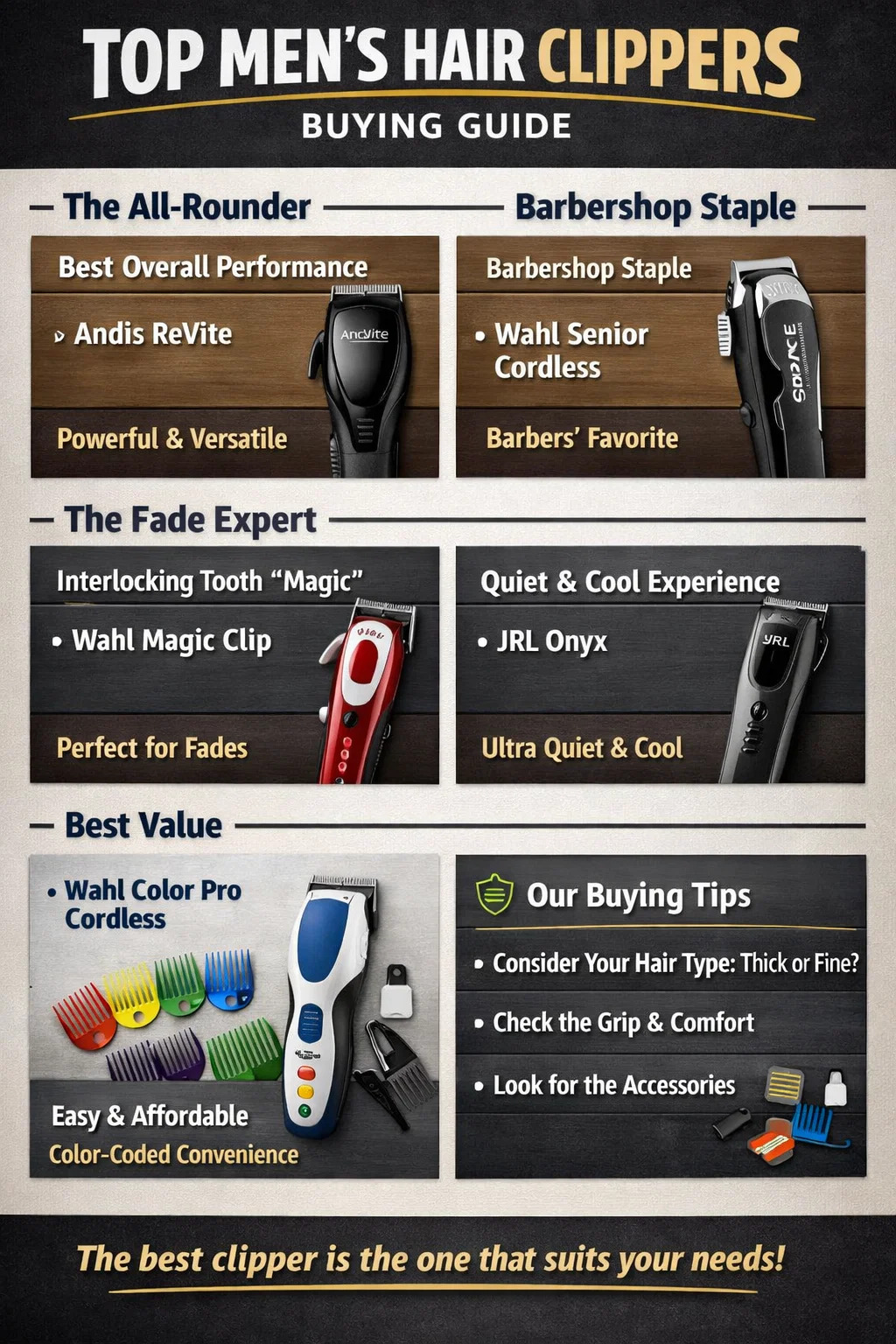 En İyi Genel Performans (örneğin, Andis ReVite): Bu, şu anda piyasada bulunan en üst düzey seçenektir. Güçlü, profesyonel kalitede motoru ev kullanımı rahatlığıyla mükemmel bir şekilde birleştirir. Kesme hızı son derece hızlı olmakla kalmıyor, aynı zamanda bıçaklar temizlik için kolayca çıkarılabilir ve yeni başlayanların bile üst düzey bir his yaşamasına olanak tanıyor.